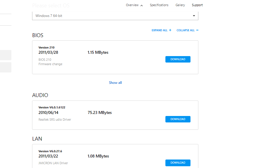 #3 dan anda akan diarahkan ket tab baru, disini pilih sistem operasi anda, dan akan muncul semua driver untuk laptop asus anda misalnya Lan.audio,touchpad dll, dan silahkan download,cara penginstalan seperti biasa. setelah terdownload lalu extract file dan jalankan setupya.
